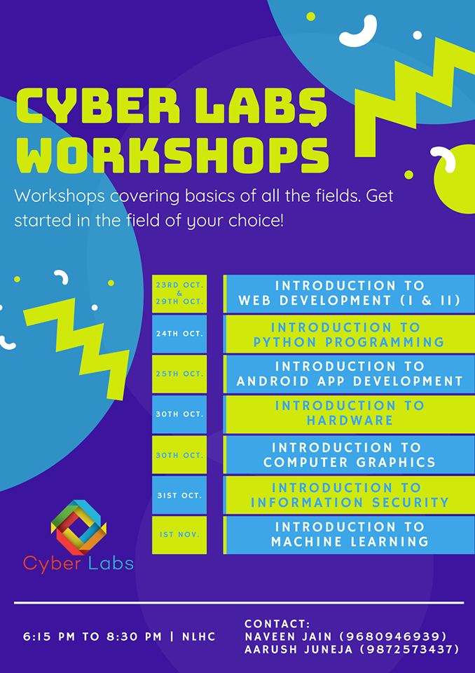 Cyber Labs organized its annual introductory workshops to introduce you all to all the fields we recruit for, namely, Web Development, Android App Development, Machine Learning & Deep Learning, Hardware, Computer Graphics and Information Security.